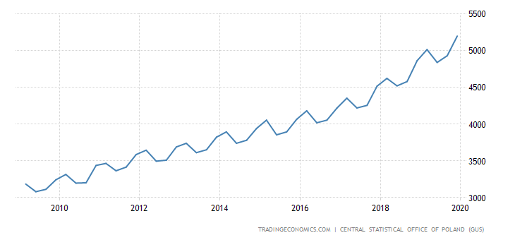 Но... это всё на т.с. "глобальном" уровне и мне (как думаю и большиснтву из Вас) "потрогать" это наврядли придётся. А вот есть ли кто-то кто т.с. "чином" пониже кто всё таки остался в плюсе? и тут лейдис & джентс предлагаю вам взглянуть на данный график по данным польской статистичексой службы. https://tradingeconomics.com/poland/wages